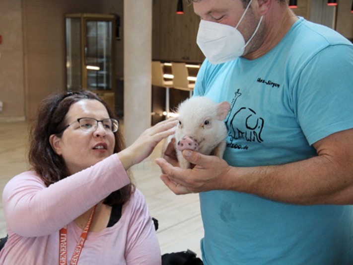 Beine und Rollstuhlreifen flitzte ein junges Mini-Schwein umher und