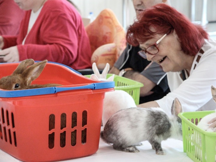 den zusammengestellten Tischen hoppelten quietschvergnügte Kaninchen